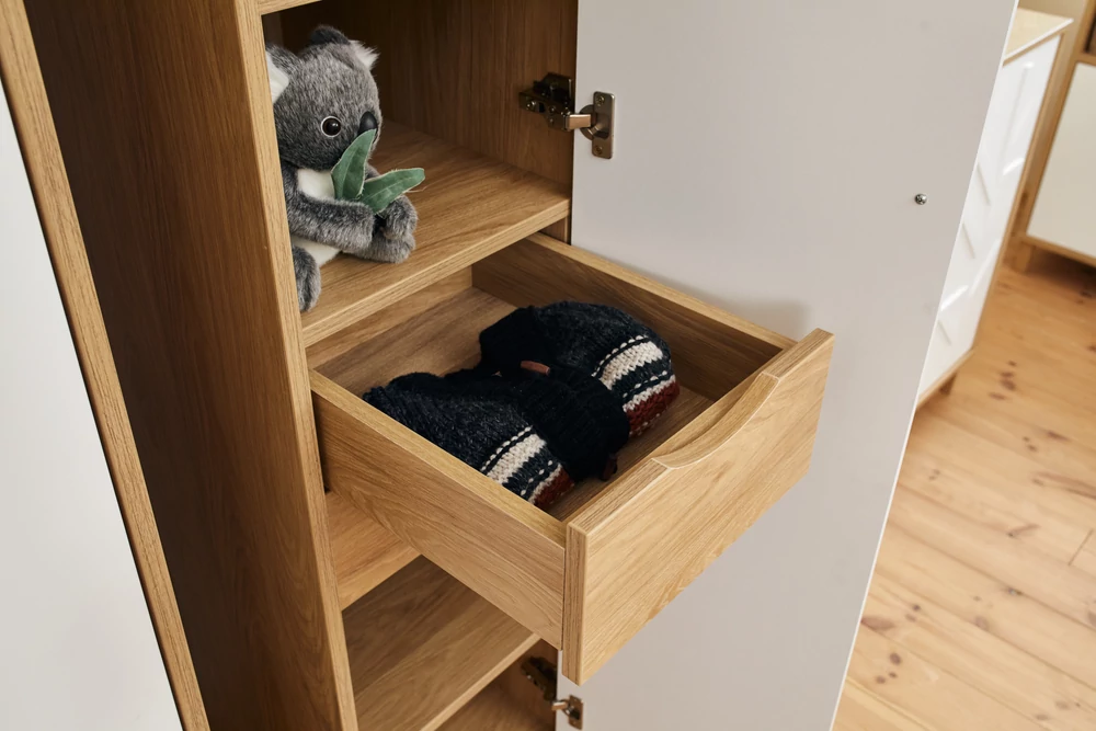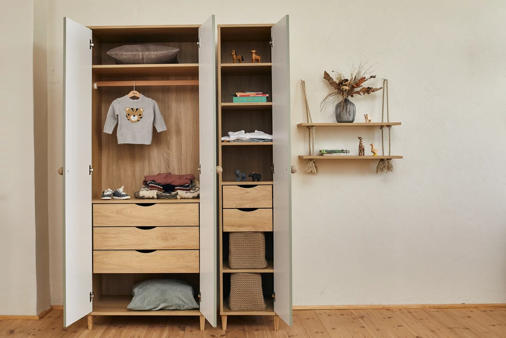 Ruhásszekrényünket úgy terveztük, hogy többfajta tárolási lehetőséget kínáljon, ennek köszönhetően újszülött kortól felnőtt korig is használható.