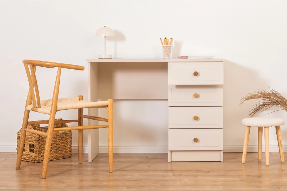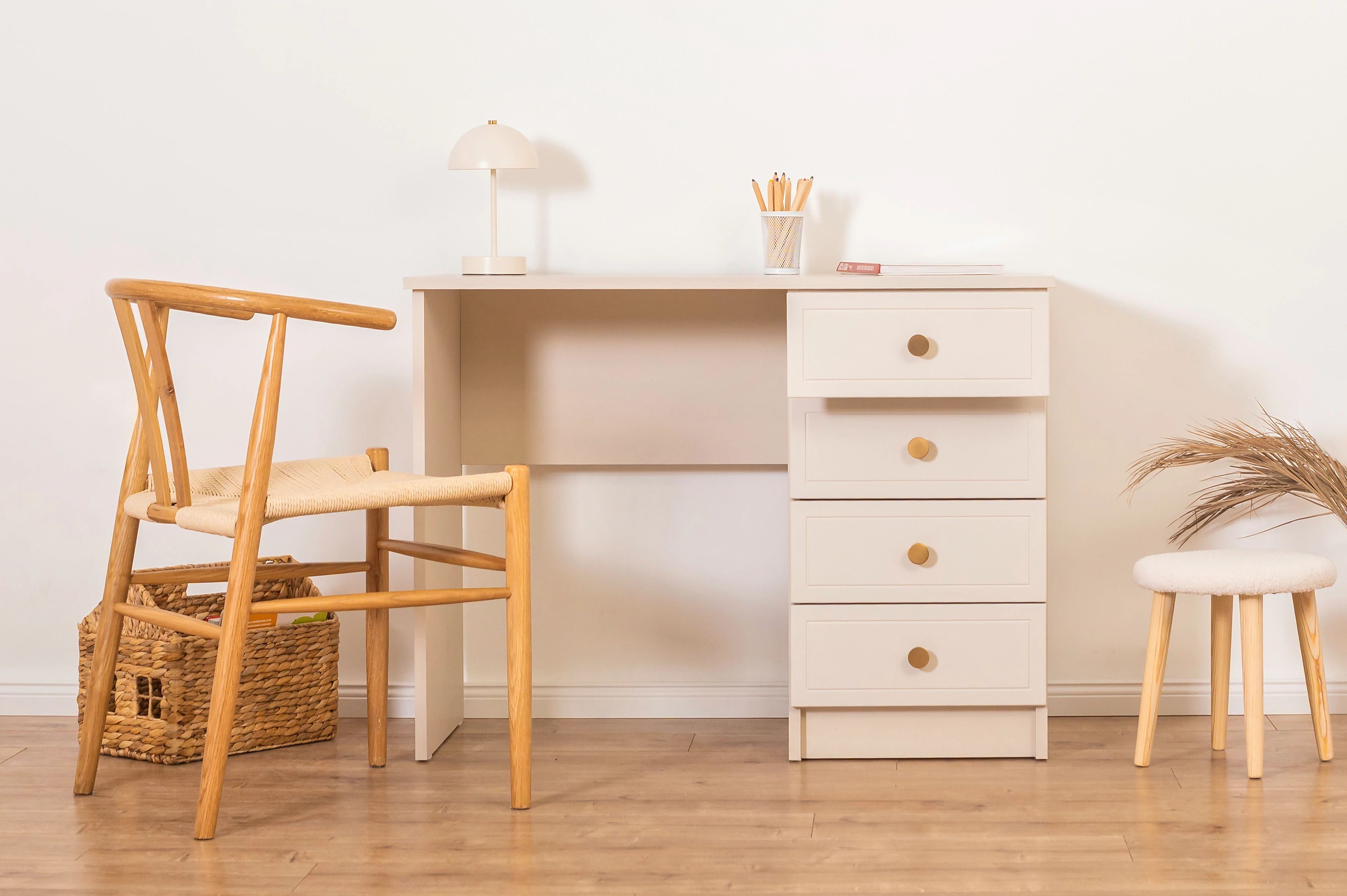 Négy fiókja bőséges tárolóhelyet kínál írószereknek, füzeteknek és minden apróságnak, ami a kéznél kell legyen. Kompakt méretének és neutrális árnyalatának köszönhetően könnyen illeszkedik a kollekció többi darabjához, és hosszú távon is megállja a helyét.