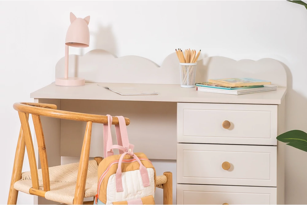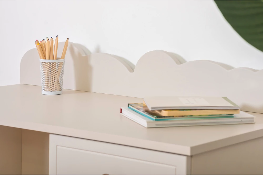 A hátoldalon található felhő formájú, levehető dekorpanel a kollekció meghatározó eleme – kedves részlet a kisebbeknek, amit később, ha már nincs rá szükség, egyszerűen eltávolíthatunk. Így az íróasztal idővel klasszikus, minimál stílusú darabbá válik, amely hosszú éveken át megállja a helyét.