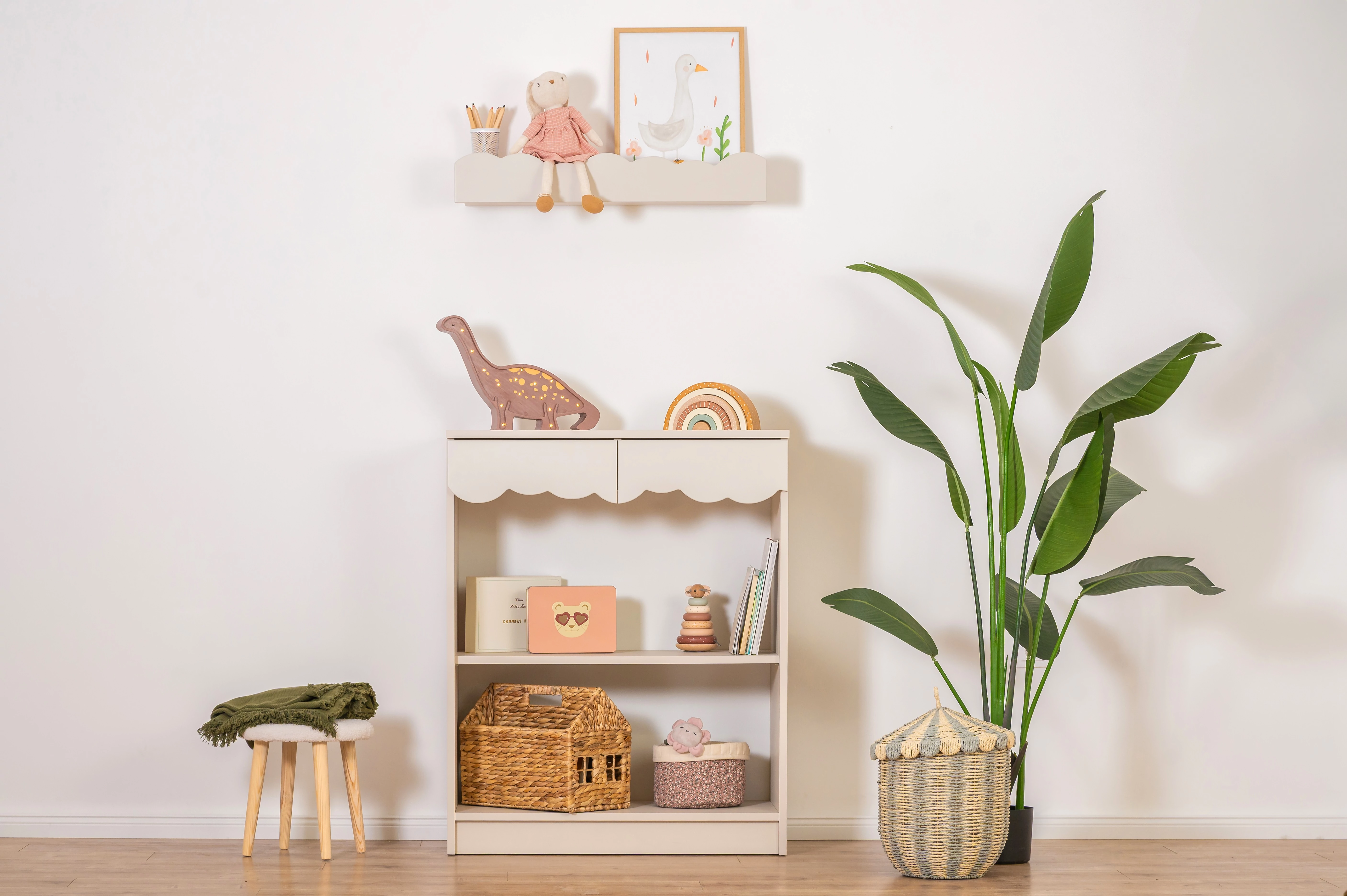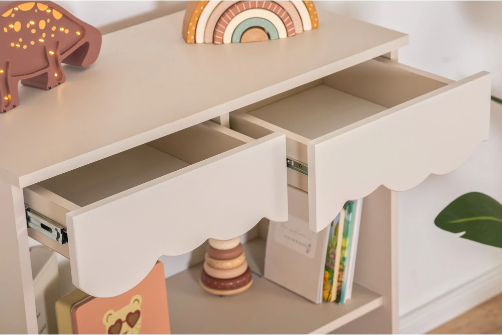 A nyitott polcok ideálisak mesekönyvek, játékok vagy dekorációk számára, míg a felső fiókok diszkréten elrejtenek minden apróságot, amit nem szeretnél szem előtt tartani. Kompakt méretének köszönhetően akár kisebb terekbe is könnyedén elhelyezhető.
