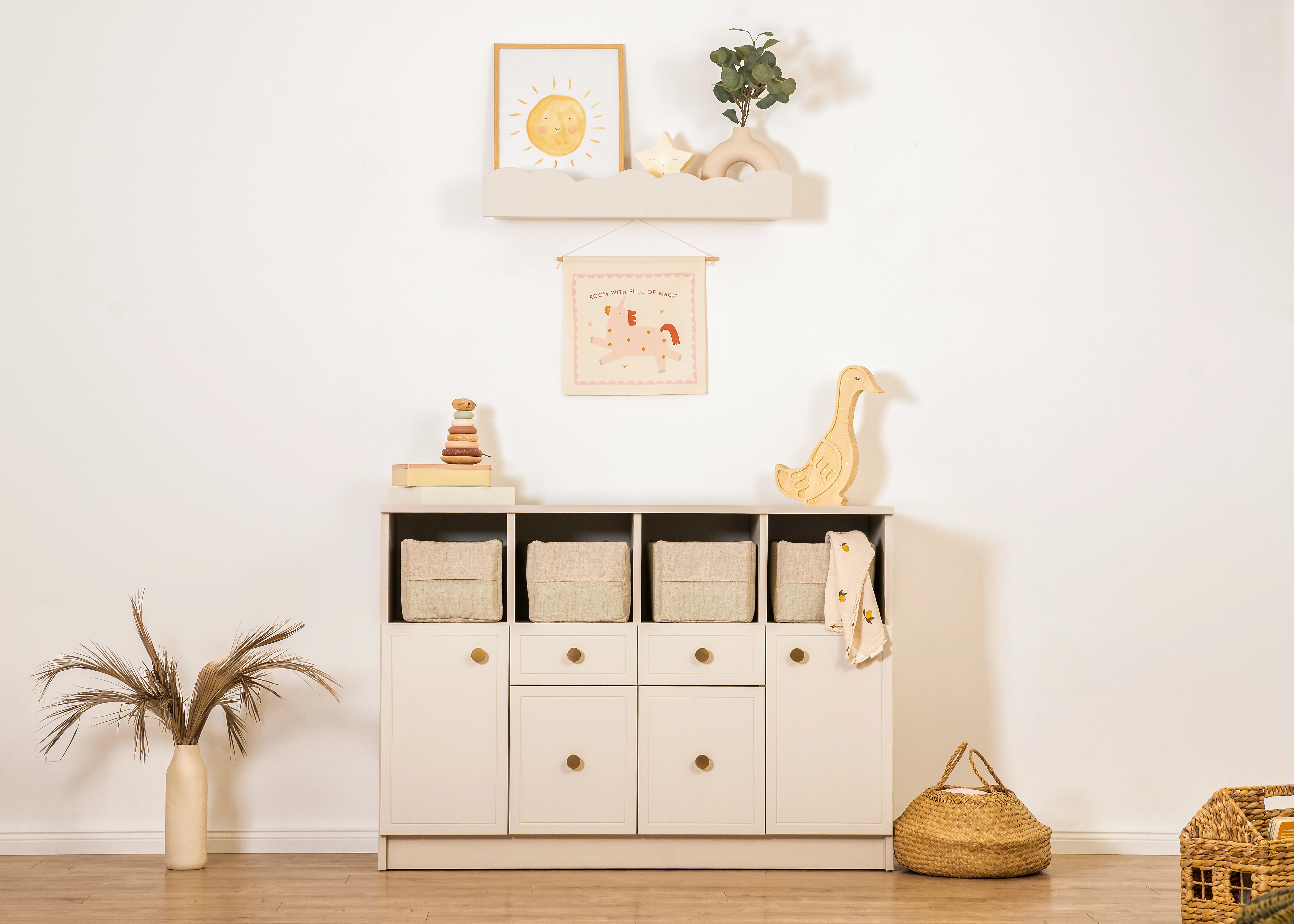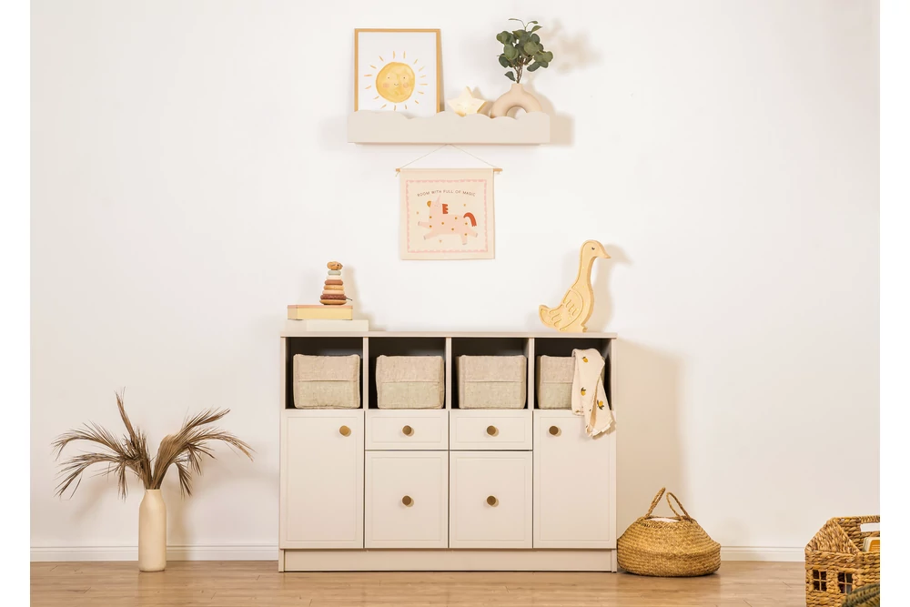 A Mellow kollekció nagyméretű pelenkázó komódja tökéletes társ a rendezett babaszobához. Tágas fiókjaiban, ajtós és nyitott tárolórészeiben mindennek megvan a helye – a ruháktól a pelenkákon át a játékokig. A letisztult vonalak és a színvilág időtlen stílust képviselnek, amit könnyű bármilyen enteriőrbe beilleszteni.