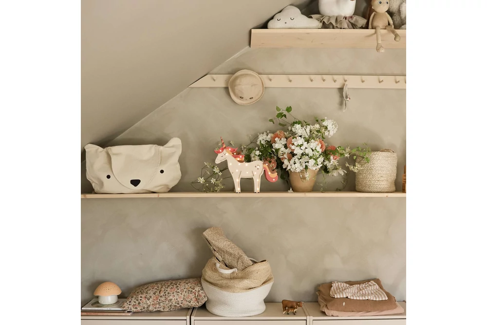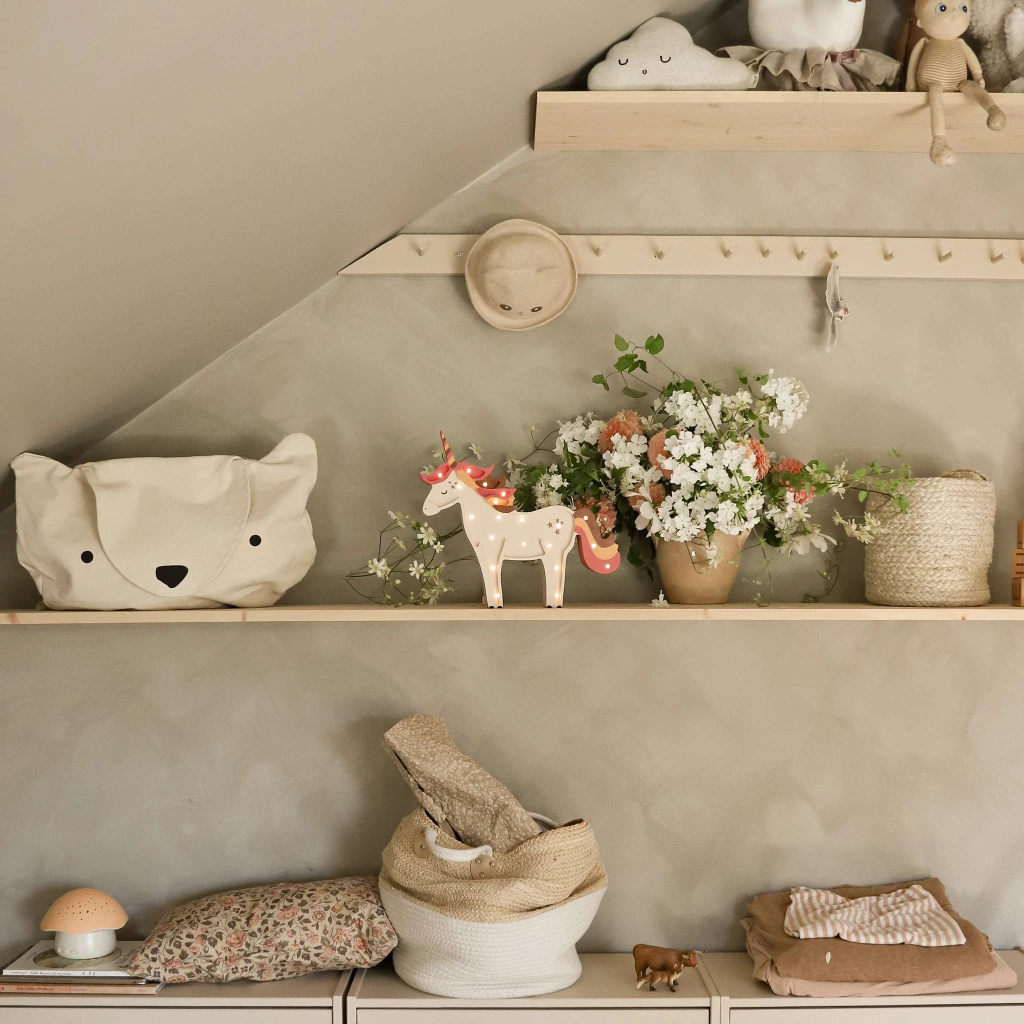 A tömör fenyőfából készült roomGAGA lámpa egyszerre dekorál és meleg fénnyel árasztja el a gyerekszobát.